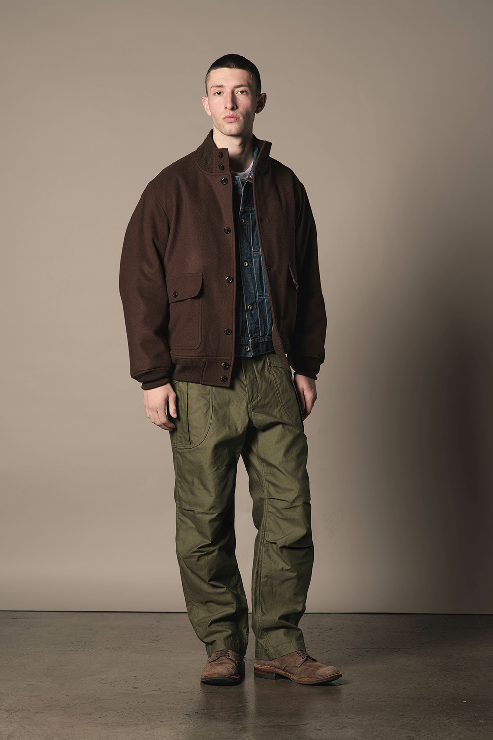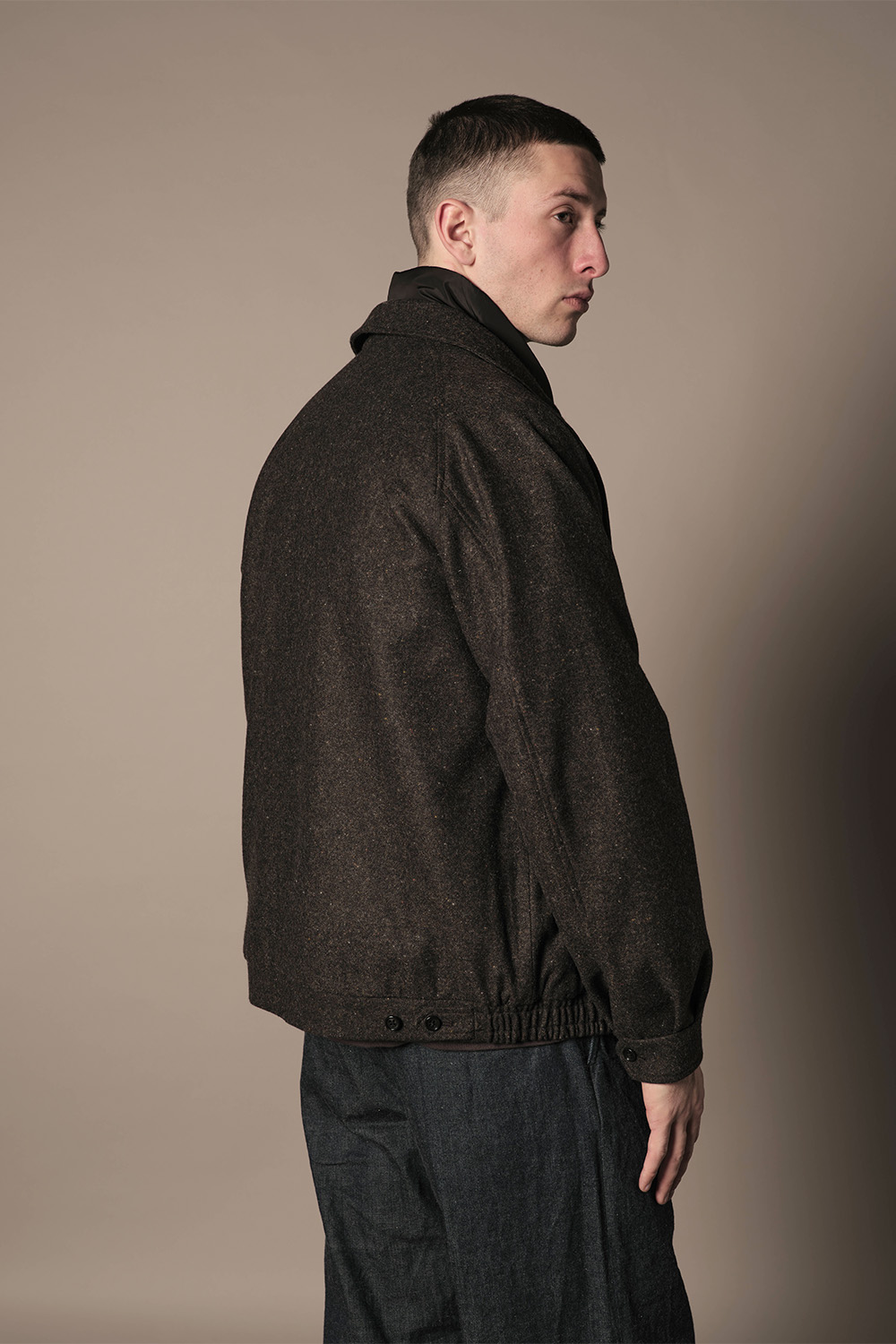 クラシックで温かみのあるホームスパン生地を使用した、ハリントンジャケット。
