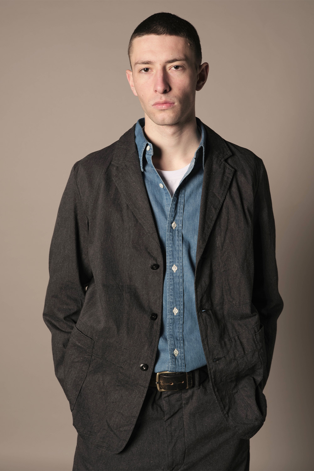 セットアップに合わせたいレギュラーカラーのデニムシャツ。