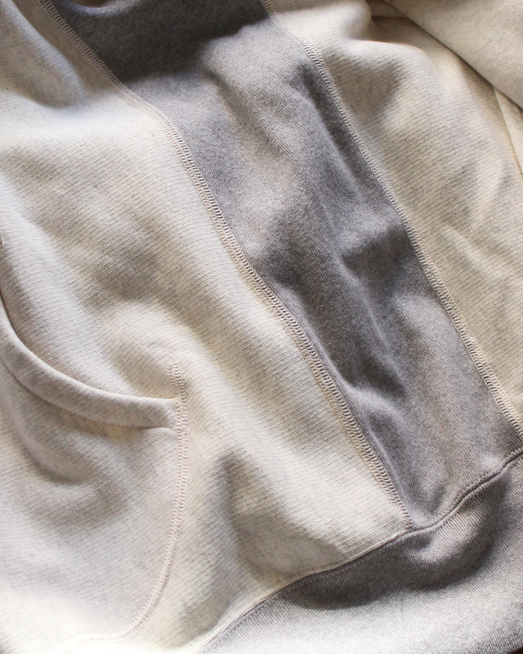 気づかれる方は流石ですが、アボンタージのスウェットシリーズは肩の接ぎを無くし、前身~後ろ身を1枚で裁断した贅沢な仕様になっています。