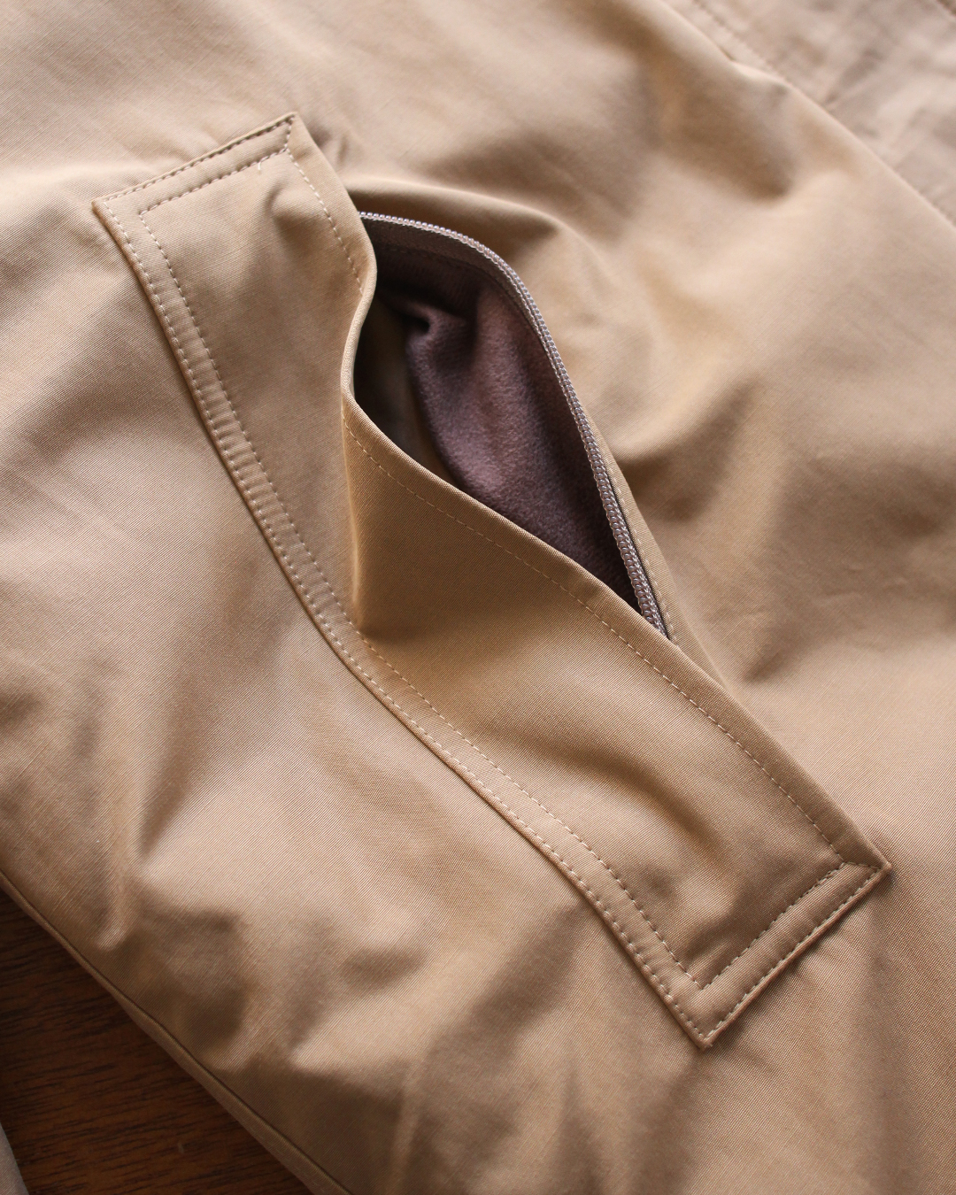 大型のハンドウォーマーポケットは、内側が起毛素材で切り替えられ手袋いらずの仕様に。