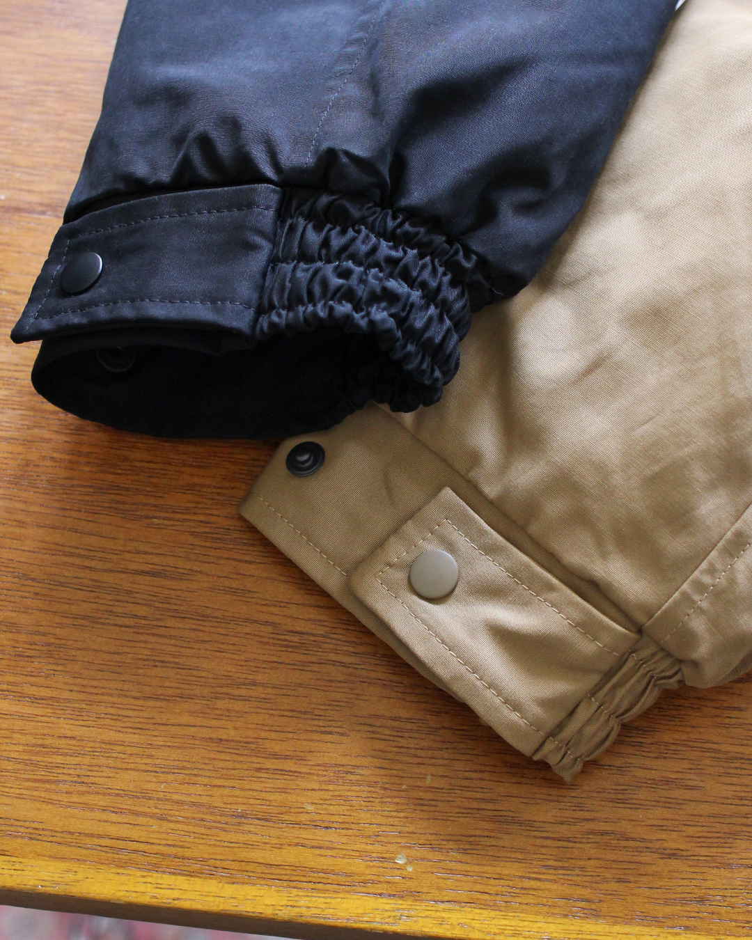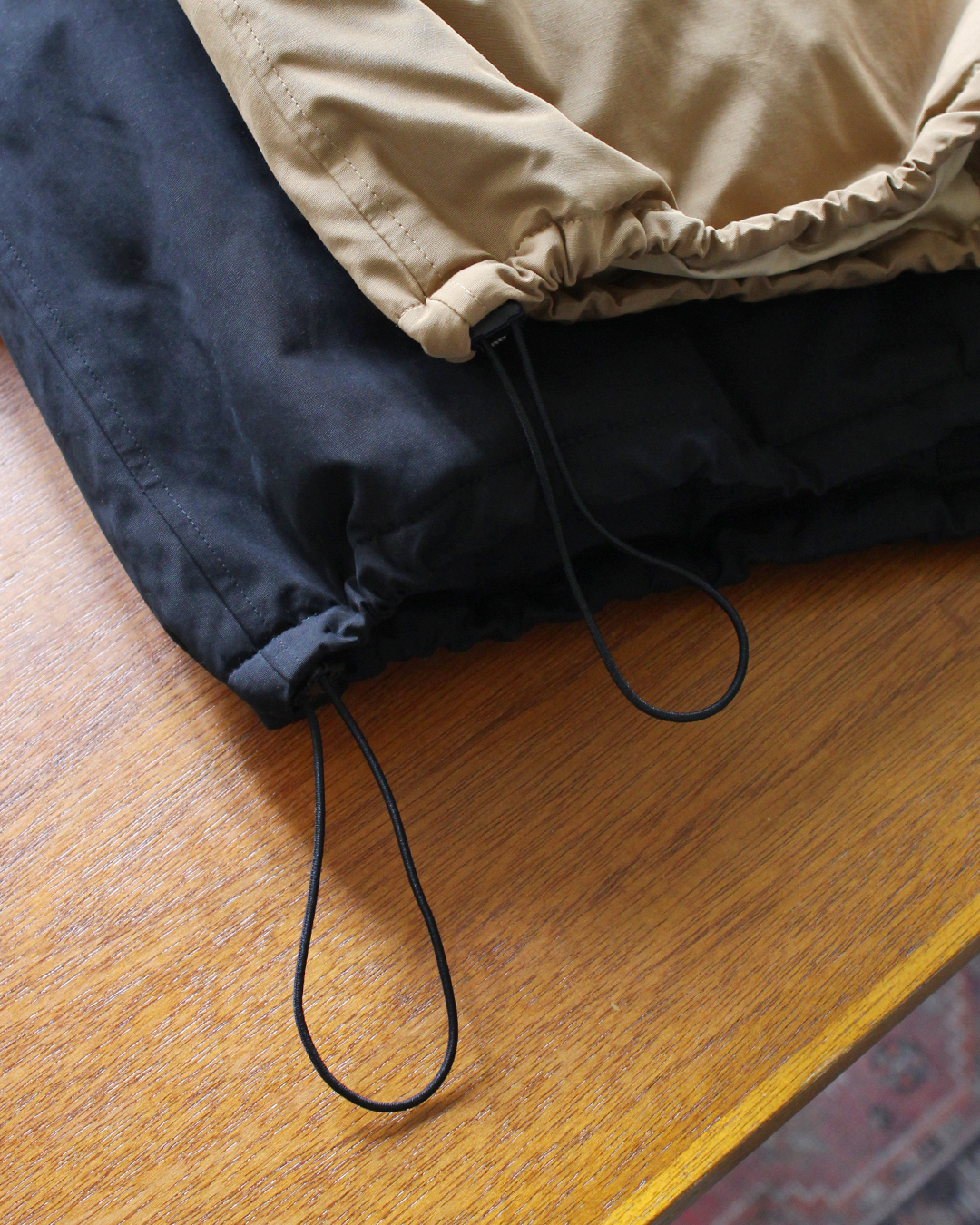 袖先はシャーリングゴム+カフスボタンで調整ができ、裾にもドローコードが入るためシルエットの変更が可能。