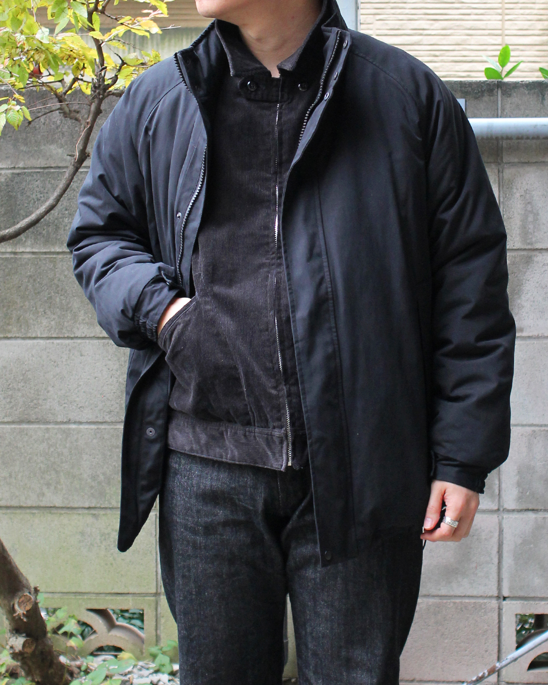 コットンナイロン×コーデュロイ×デニムのALL BLACK。