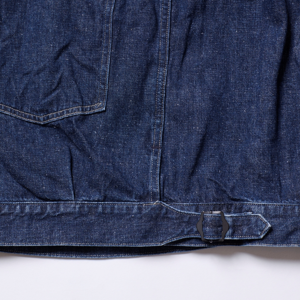 脇にスリットを入れて腰帯にスライドバックルを配してウエストのシルエットに変化を付けれる仕様に。アメリカとユーロのワークウェアのディティールをブレンドしたジャケットです。