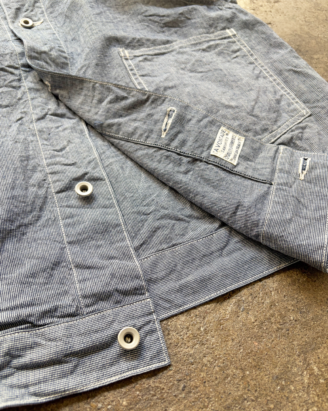 60年代のワークウェアに使用されていたインディゴ糸と生成を交互に打ち込んだハケ目の10ozシャンブレー。
