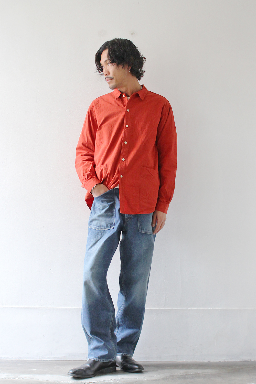 *A VONTADEならではのHARVESTカラーのシャツの合わせでより雰囲気をだしたコーディネートを組みました、デニムの個性がでていてシンプルな合わせでも良し。