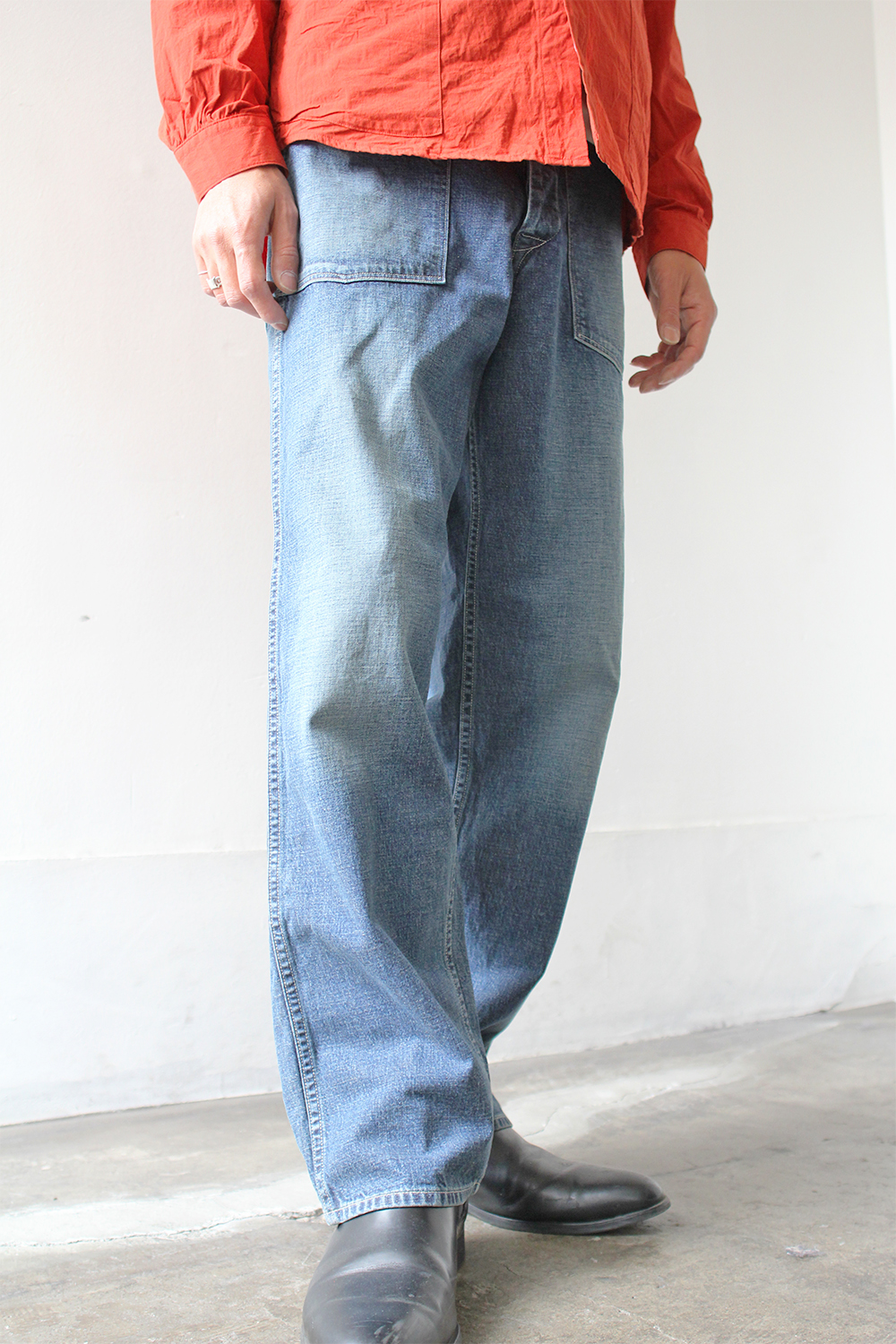 裾にかけて適度な太さのある直線的なシルエット。このデニムを履いてるだけで雰囲気が絶妙にでますね。